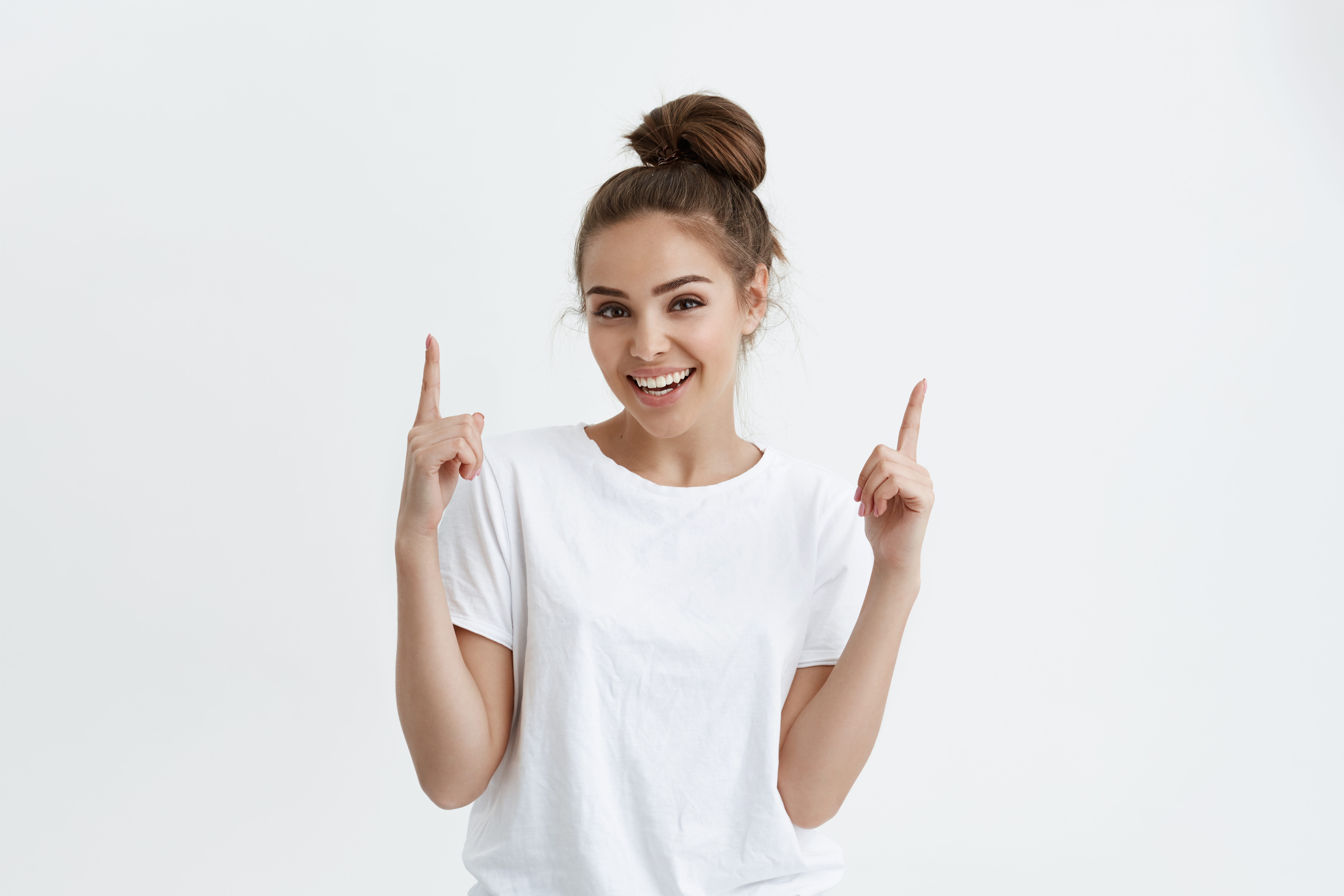 Positive european woman pointing up with both index fingers while smiling cheerfully at camera, standing over white background. Modern woman brags about her new ceiling that was made by famous painter